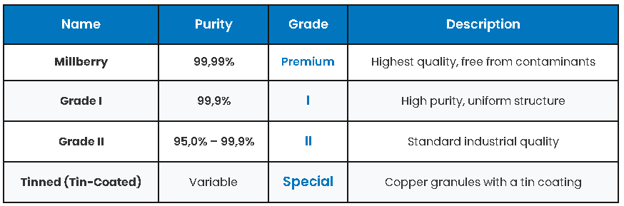 | Tinned (Tin-Coated) | Variable | Special | Copper granules with a tin coating |
